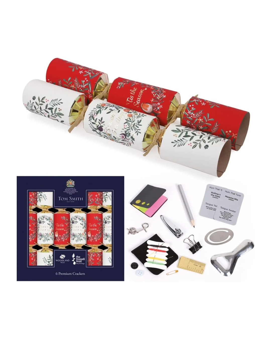 - ENJOY A SUSTAINABLE CHRISTMAS: These crackers are made in partnership with the Woodland Trust and have been designed with the environment in mind, crafted without single-use plastic materials, glitter & plastic decorations. Tom Smith are proud to support the Trussel Trust with with a donation for every cracker sold aiding food banks in the UK